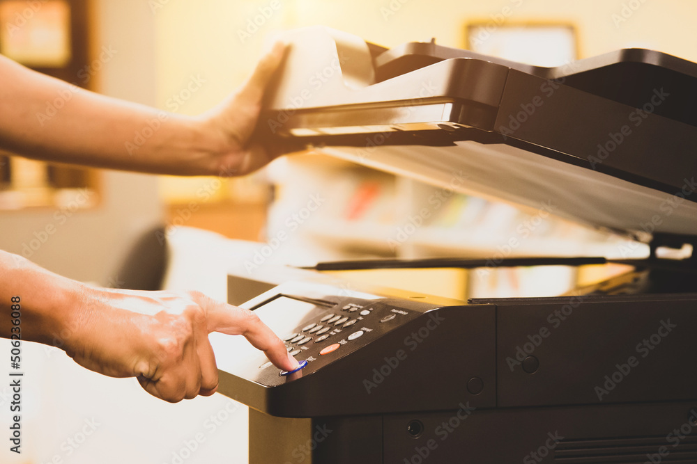 Copier printer, Close up hand office man press copy button on panel to using the photocopier or photocopy machine for scanning document printing a sheet paper and xerox photocopy.