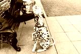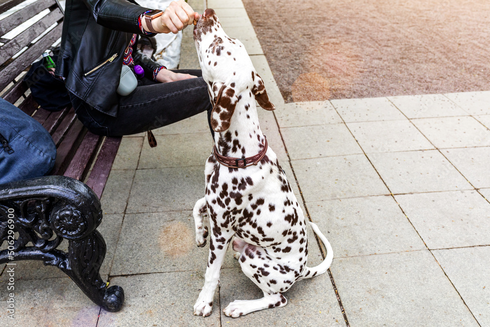 Hostess is playing with her pet. Dog Dalmatian performs stand for treat from the hostess. Walking dogs
