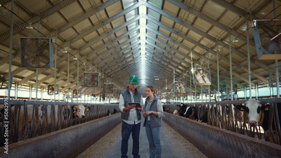 Animal farm managers talking holding tablet computer inside modern cowshed barn.
