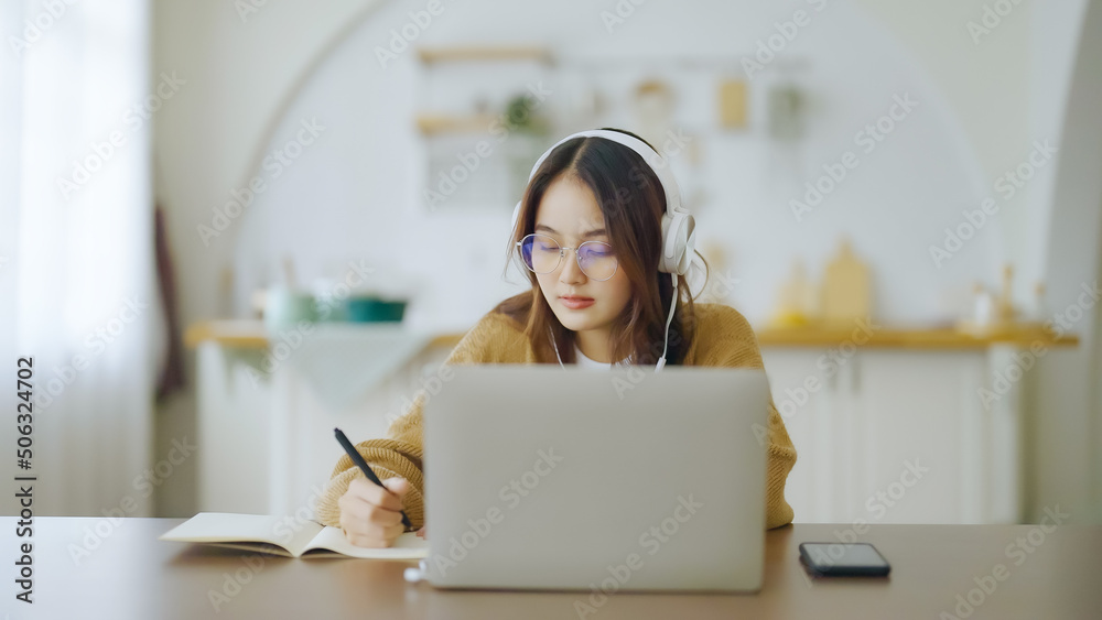 Young asian woman wearing glasses and headset working on computer laptop at house. Work at home, Video conference, Video call, Student learning online class
