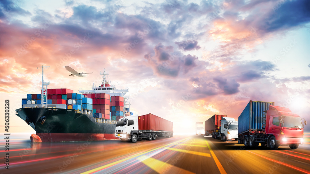 Logistics import export of containers cargo freight ship, truck transport with red container on highway at port cargo shipping dock yard background, copy space, plane, transportation industry concept