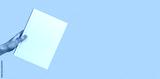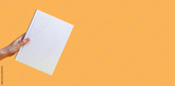 Banner with hand holding book mockup on orange background. Education, reading hobby, wisdom, intellectual development concept. Copy space. High quality photo