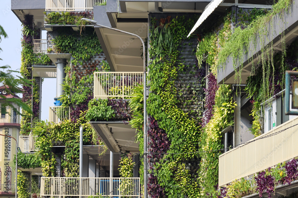 selective focus of green building filled with vertical garden on the wall