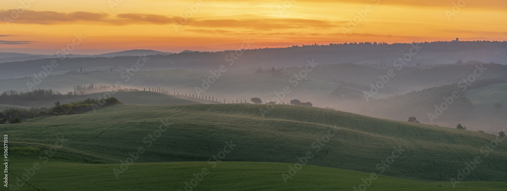 Fairytale, misty morning in the most picturesque part of Tuscany, val de orcia valleys