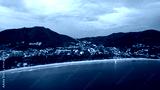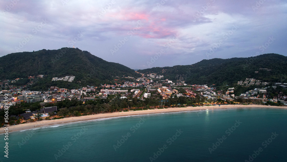 Aerial view of the island at sunset from a drone. Tall palm trees and trees grow. In the distance there are hotels, sports fields, green hills and pink clouds. A place to rest. Phuket Island, Kata