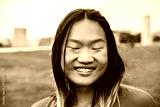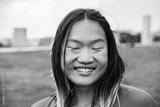 Asian girl smiling on camera at city park - Focus on face - Black and white editing