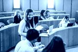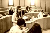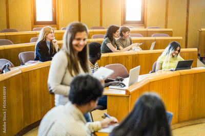 Mature teacher working inside classroom at school university - Focus on couple of students sitting together