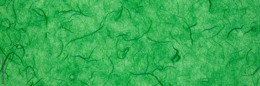 background of green backlit, handmade, mulberry paper with fiber inclusions, panoramic web banner