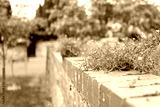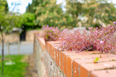 Shallow focus of mauve weeds seen growing in the mortar between bricks on a garden wall. The wall is showing signs of cracking.