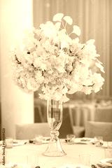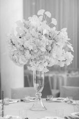 festive wedding decoration. Beautiful fresh white and pink flowers in glass vase on dining table on wedding day. High quality photo