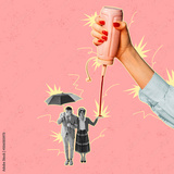 Contemporary art collage. Stylish couple walking under umbrella isolated over pink background. Female hand squishing ketchup