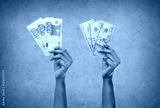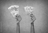 finance, currency and people concept - close up of male hands holding dollar and euro money over grey stone background