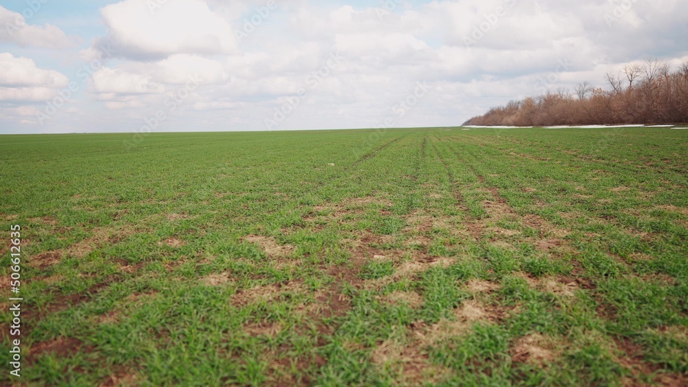 green wheat sprouts on early spring field. farming wheat green field agribusiness concept. walk lifestyle in a large wheat field. agriculture young crop of green wheat in spring on field landscape