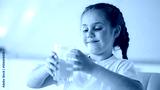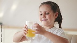 girl child drinking juice. happy family a healthy eating kid dream concept. indoors daughter girl drinking yellow juice from a glass cup in the kitchen. child drinking fruit juice
