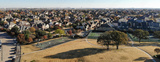 Panorama aerial view large grassy park square near tennis courts complex in residential neighborhood with colorful fall foliage near Dallas, Texas, America