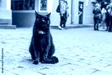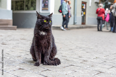 A smart black stray cat is sitting on a cobblestone pavement in the city. Homeless animal sitting on sidewalk in urban environment. Looking past the camera.