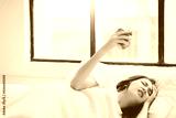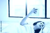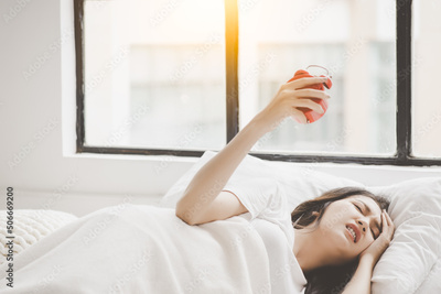Young beautiful asian woman hate waking up early in the morning Young woman pressing snooze button on early morning alarm clock Headache girl stopping alarm clock on her bed in early morning on Monday