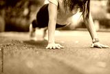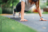 Fitness training outdoor, Healthy lifestyle concept Closeup - Sport woman doing push ups in the park.