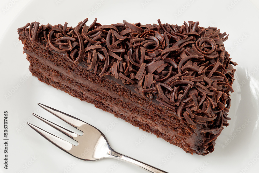Slice of chocolate cake with cream filling and chocolate shavings next to fork from above.