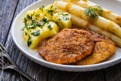 Fried schnitzel and white boiled asparagus with potato served on wooden table