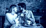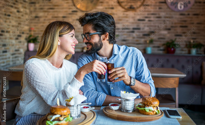 Young couple sitting in a cafe, having breakfast. Love, dating, food, lifestyle concept