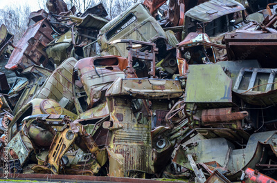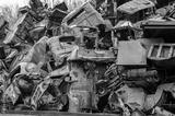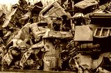 Piles of old cars in scrap metal yard ready for recycling, close-up
