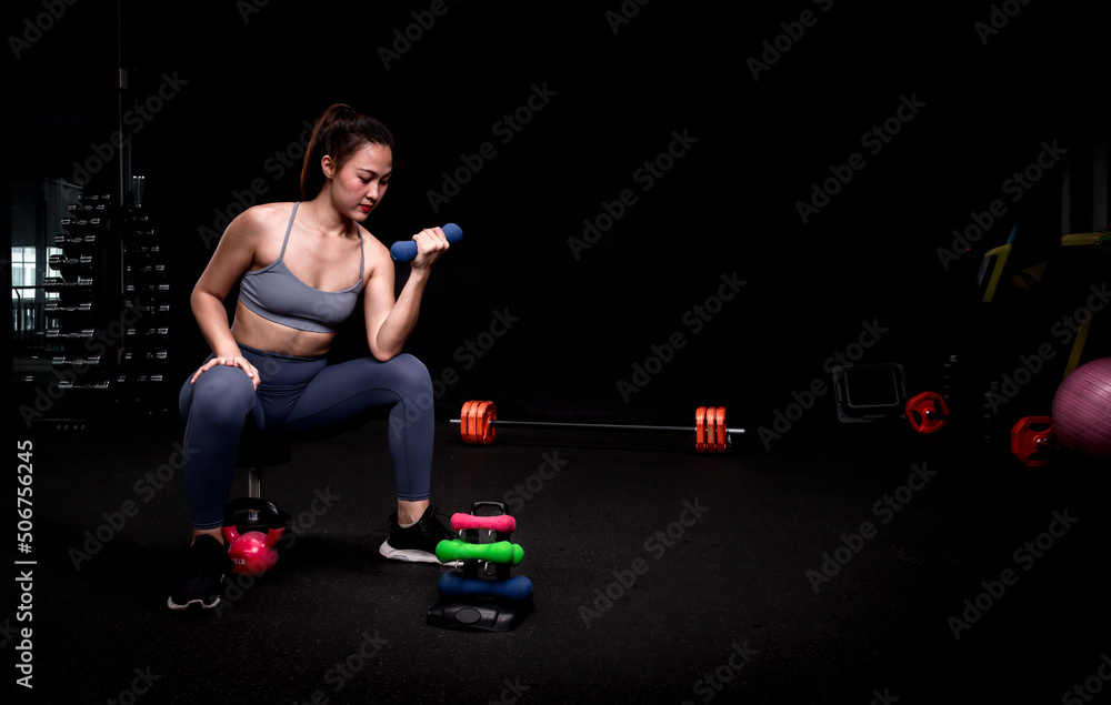 Sport fitness woman wear sportwear posing under exercise with dumbbell equipment at gym ,she exercise for strong ,make muscle body building and good healthy with black background.