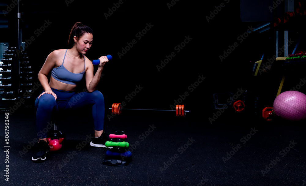Sport fitness woman wear sportwear posing under exercise with dumbbell equipment at gym ,she exercise for strong ,make muscle body building and good healthy with black background.