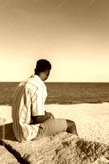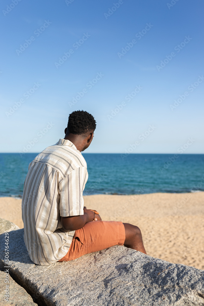 Rear view of African american man relaxing looking at the ocean during his vacation trip. Copy space. Vertical image.