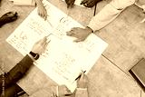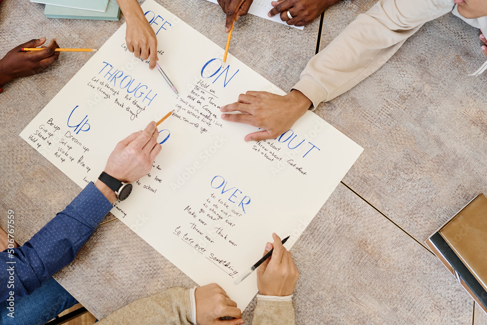 High angle view of unrecognizable group of students learning English phrasal verbs using handmade poster