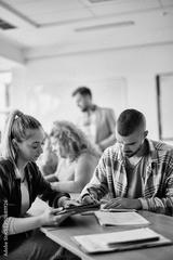 College student takes notes while studying with his female friend who is using touchpad in classroom.