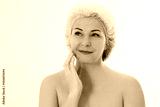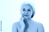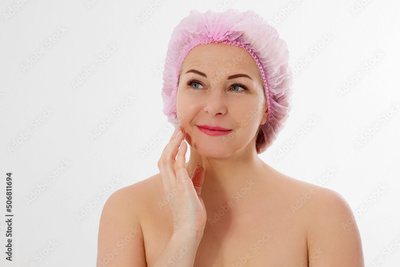 Beauty middle age woman wrinkled face portrait. Spa and anti aging concept Isolated on white background. Plastic surgery and collagen face injections. Wrinkles and menopause. Mock up. Copy space