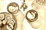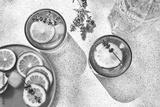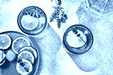 Cool lavender lemonade with lime slices and lavender flower on the table near pastel light blue background. Healthy organic summer soda drink. Detox water. Diet unalcolic coctail.
