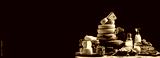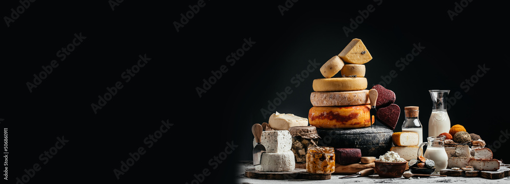 Various kind of cheese. head of handcrafted hard cheese on a dark background. banner, menu, recipe place for text,