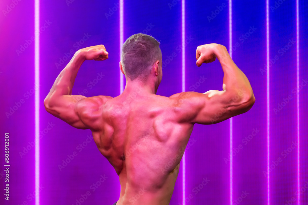 Close-up from the back of an athletic fit guy with back and bicep arm demonstrating powerful muscles, neon color purple blue background.