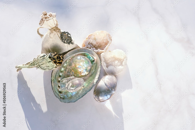 Quartz crystals, white sage bundle, abalone sea shell, witch bag on light marble background. minerals for esoteric spiritual practice, relax, meditation, magic. incense for fumigation, cleansing aura.