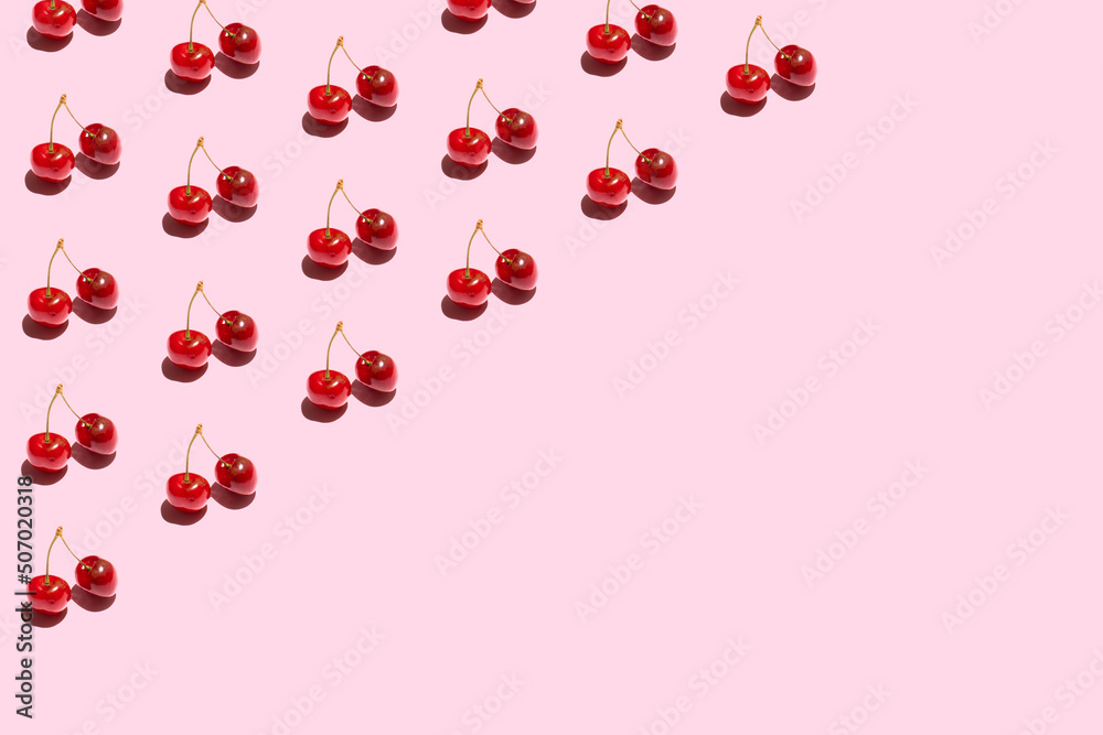 Seamless pattern with cherry. Tropical abstract background. Cherry on pastel pink background.