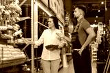 Shopping in hardware shop. Male salesman at counter advises female buyer who chooses tools for painting walls. Man in coveralls and young woman talking standing in one of aisles at warehouse.