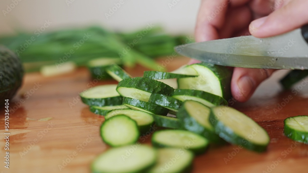 green cucumbers are cut with a knife in the kitchen. healthy food salad vegetables concept. close-up green cucumbers in the kitchen hands lifestyle close-up cut into slices