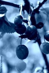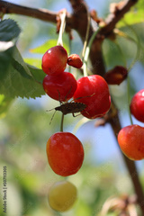 Brown Marmorated shield bug on red cherry fruits on branches. Halyomorpha halys insect in the orchard