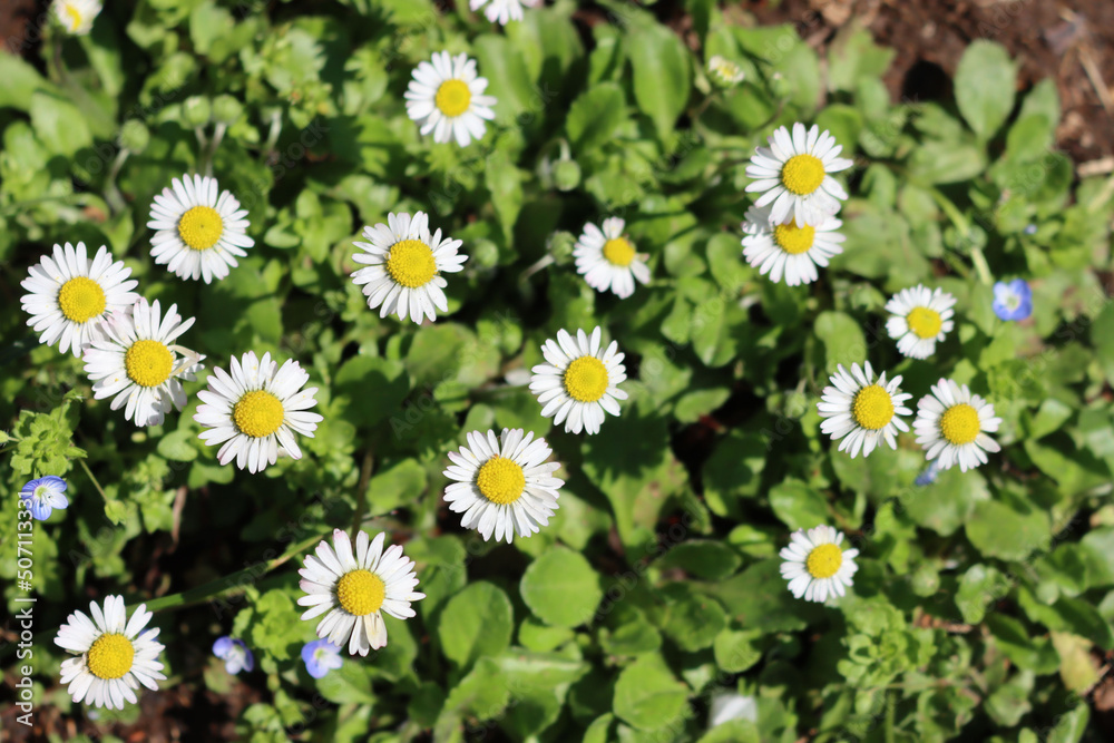 Top view of Common daisies flowers. Bellis perennis plant in bloom on springtime