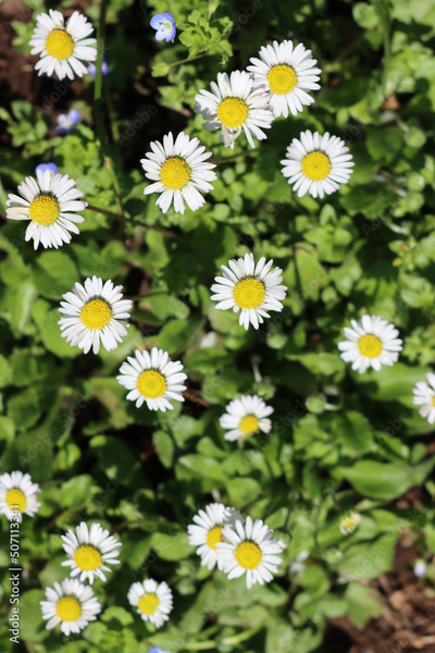 Top view of Common daisies flowers. Bellis perennis plant in bloom on springtime