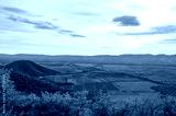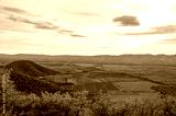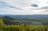 Panoramic view of Alazani valley fields and Caucasus Mountains from the height of the hill, Kakheti region, Georgia