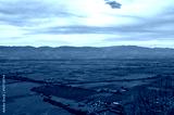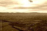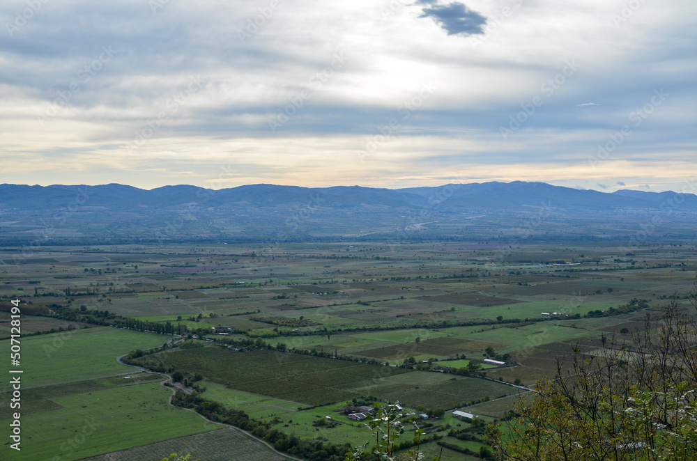 Panoramic view of Alazani valley fields and Caucasus Mountains from the height of the hill, Kakheti region, Georgia