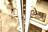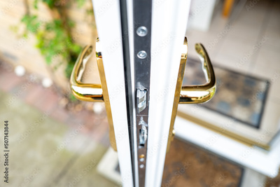 Shallow focus of the locking bolt seen on a newly installed double glazed kitchen door. Seen in the open position to facility extra space in the kitchen.