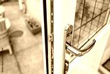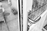 Shallow focus of the brass coloured door handle on a newly installed double glazed door. Showing the leaded window, leading out onto a patio area