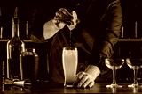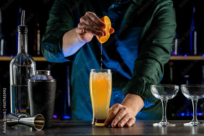 Bartender's hands serving cocktails on bar counter in a restaurant, pub. Mixed drinks. Alcoholic cooler beverage at nightclub on dark background