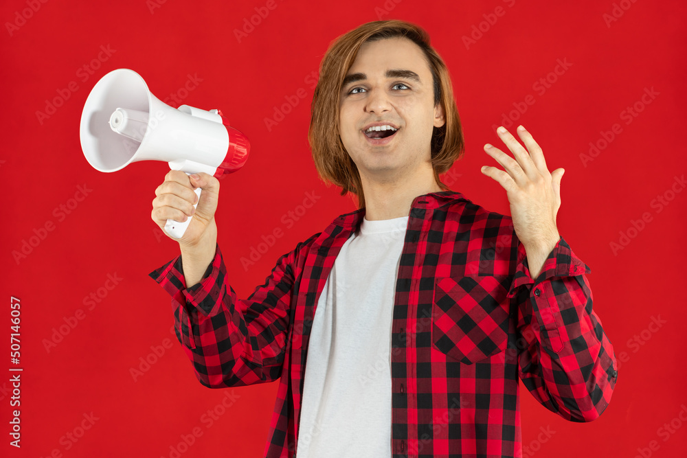Young man using an electric megaphone. Guy with speaking-trumpet, bullhorn, blowhorn, or loudhailer. Red background. Advertising, demonstration, student protest concept