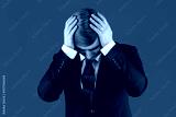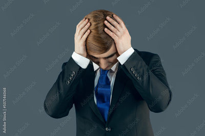 Young man rsuffering from headaches or problems. Prep Student with long hair wearing a formal suit. Portrait of guy hands on head unhappy