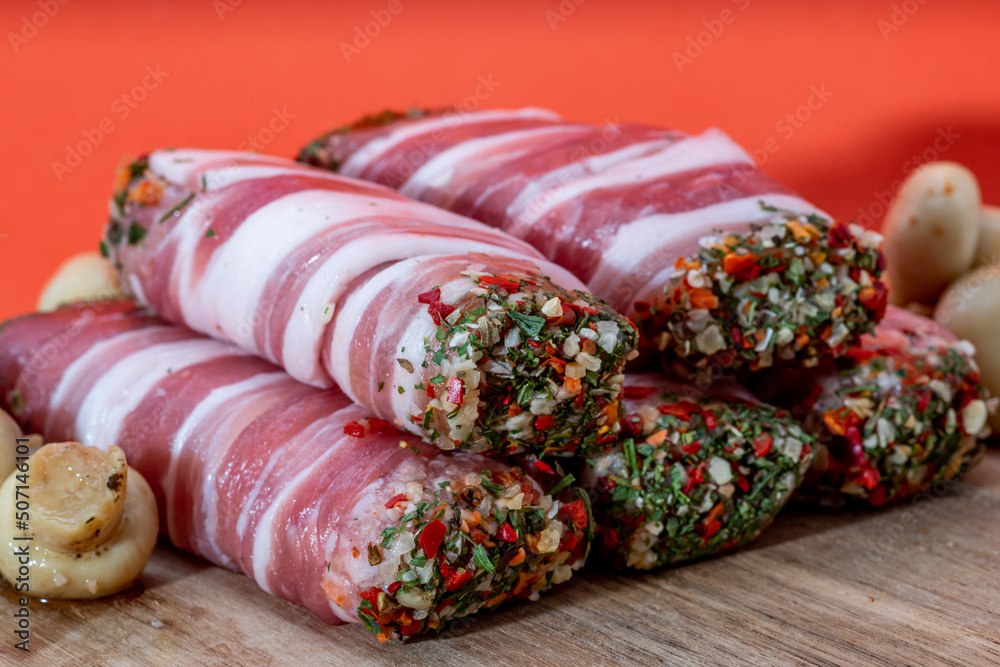 Bacon-wrapped meat roll with spices and herbs. Jamon pork, prosciutto, or presunto meat products, tartare meat inside. Meatloaf close up high focus view with shallow depth of field on a wooden board
